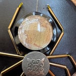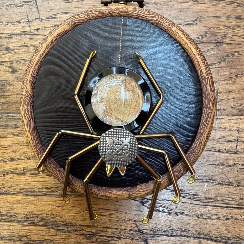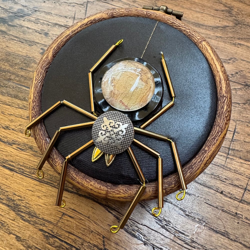 Featuring repurposed jewellery, beads and a vintage map under a dome of glass.