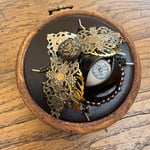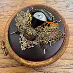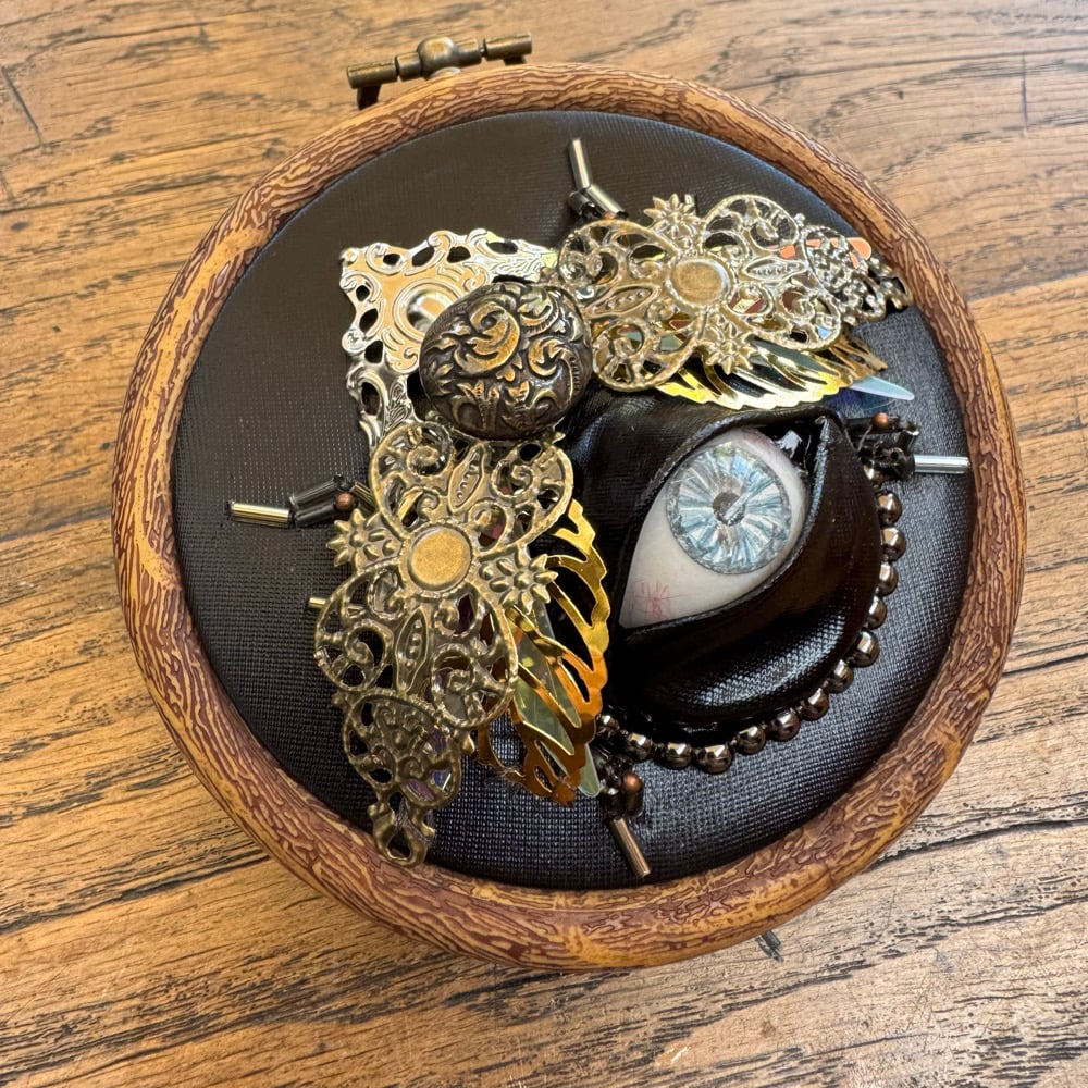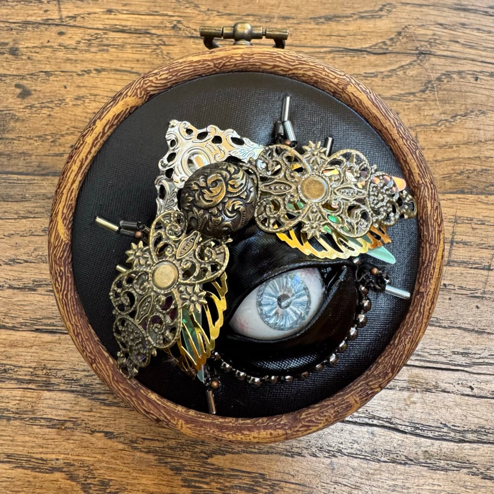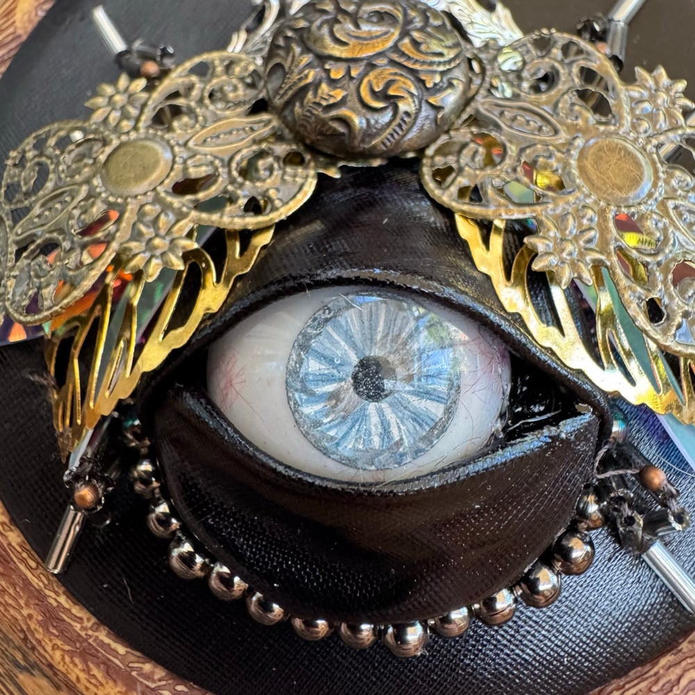 Featuring repurposed jewelley, beads and a human prosthetic eye encased in feveric.