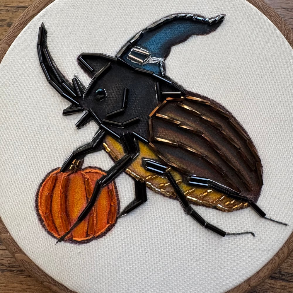 Presented on bamboo fabric on a 5 inch flexi hoop.