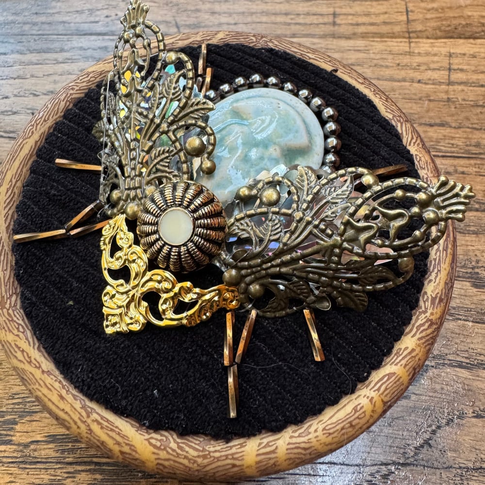 Featuring repurposed jewellery, beads, filagree and a cameo made my @shewolfstudios