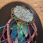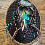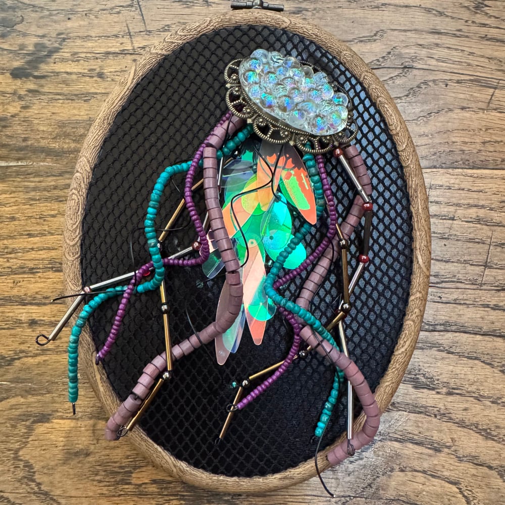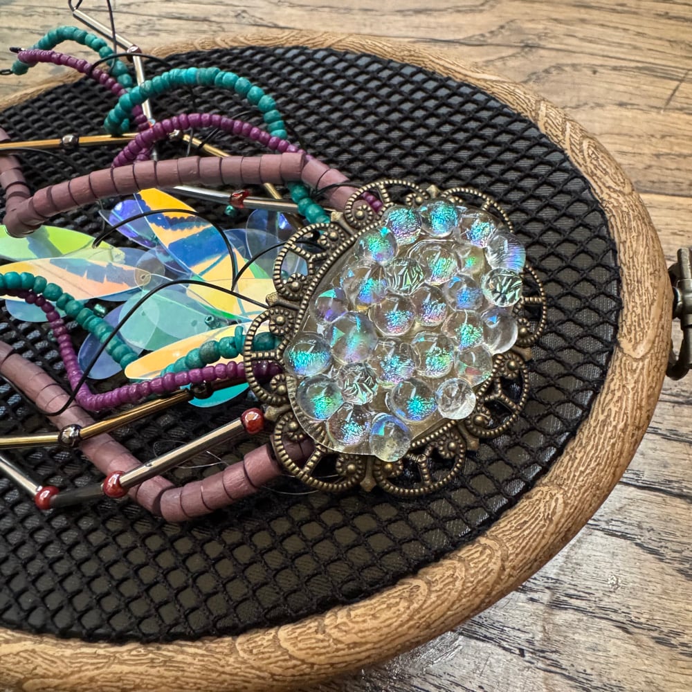 Featuring wire work, beading, sequins and fused dichroic glass from @sandandfireworks set in a metal brooch casing.
