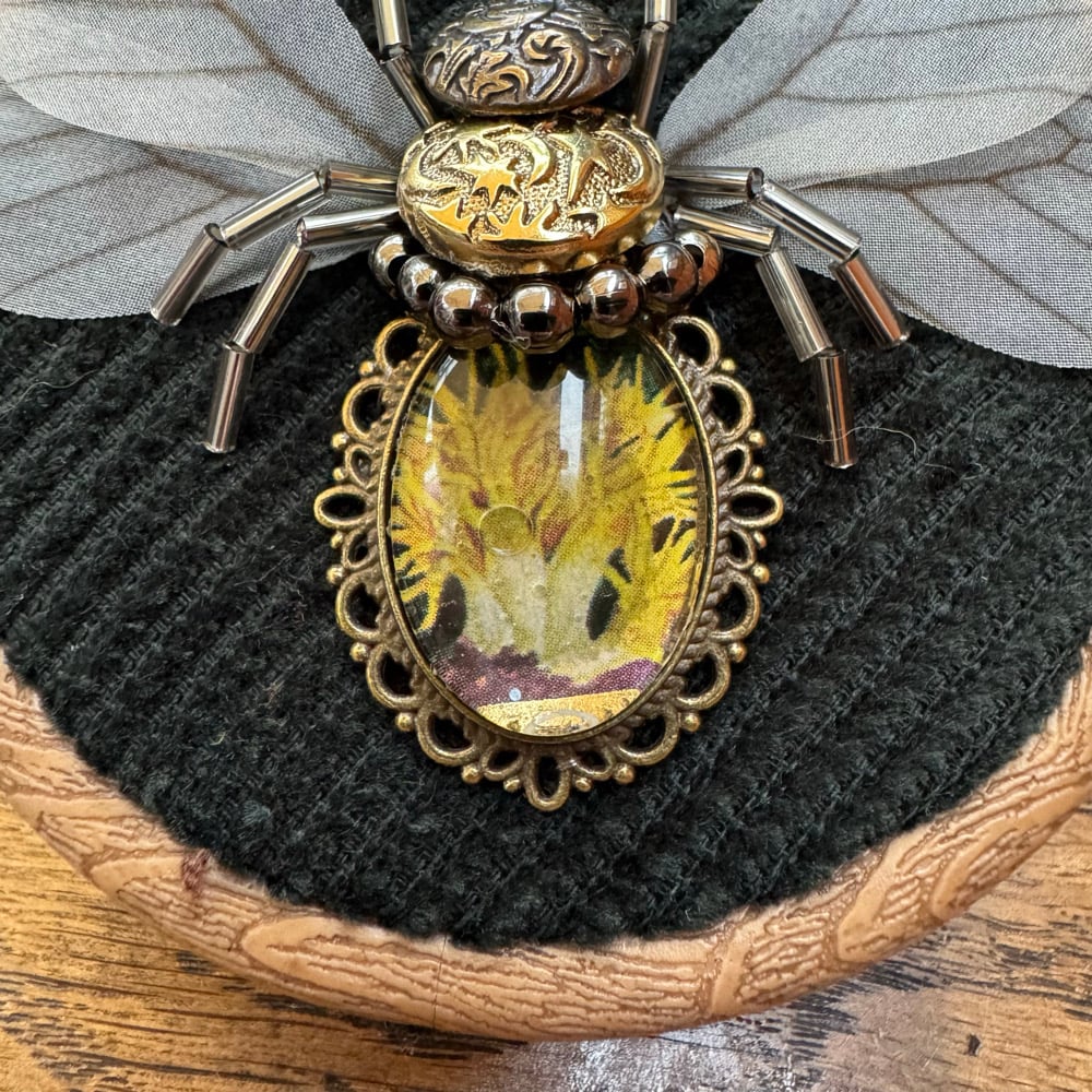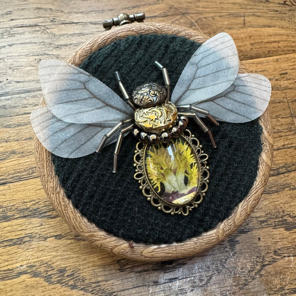 Featruing repurposed jewellery, beads, art from vintage cigar bands and cheese cloth wings.