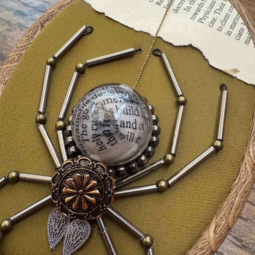 Featuring repurposed jewellery, a bead stuffed with a book page, and a scrap book page.
