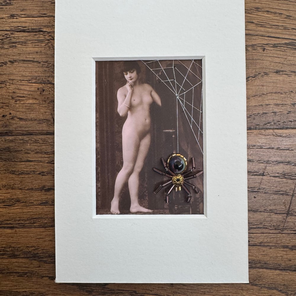 A vintage pinup phorapgrah embellished with metallic thread and a spisder.