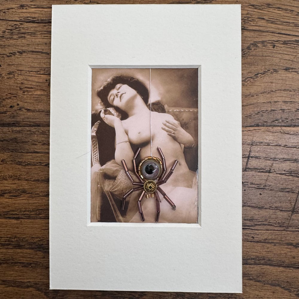 A vintage pinup phorapgrah embellished with metallic thread and a spisder.