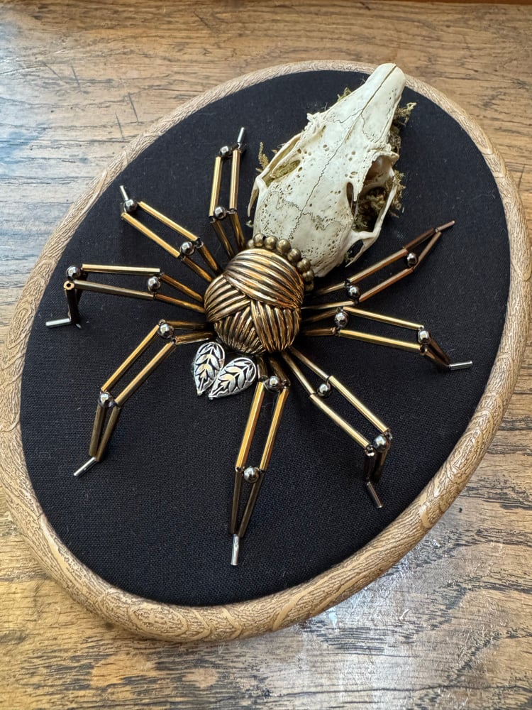 Featruing repurposed jewellery, beads and an ethicaly sourced rabbit skill placed on faux moss.