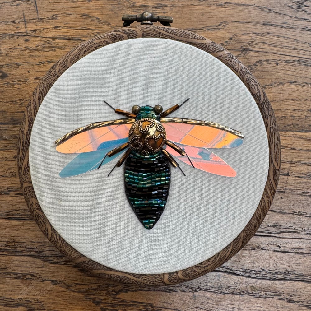 Presented on bamboo fabric in a 4 inch flexi hoop.