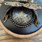 Featuring repurposed jewelley, beads, a deer vertebrae and snake shed set in a wooden brooch setting.