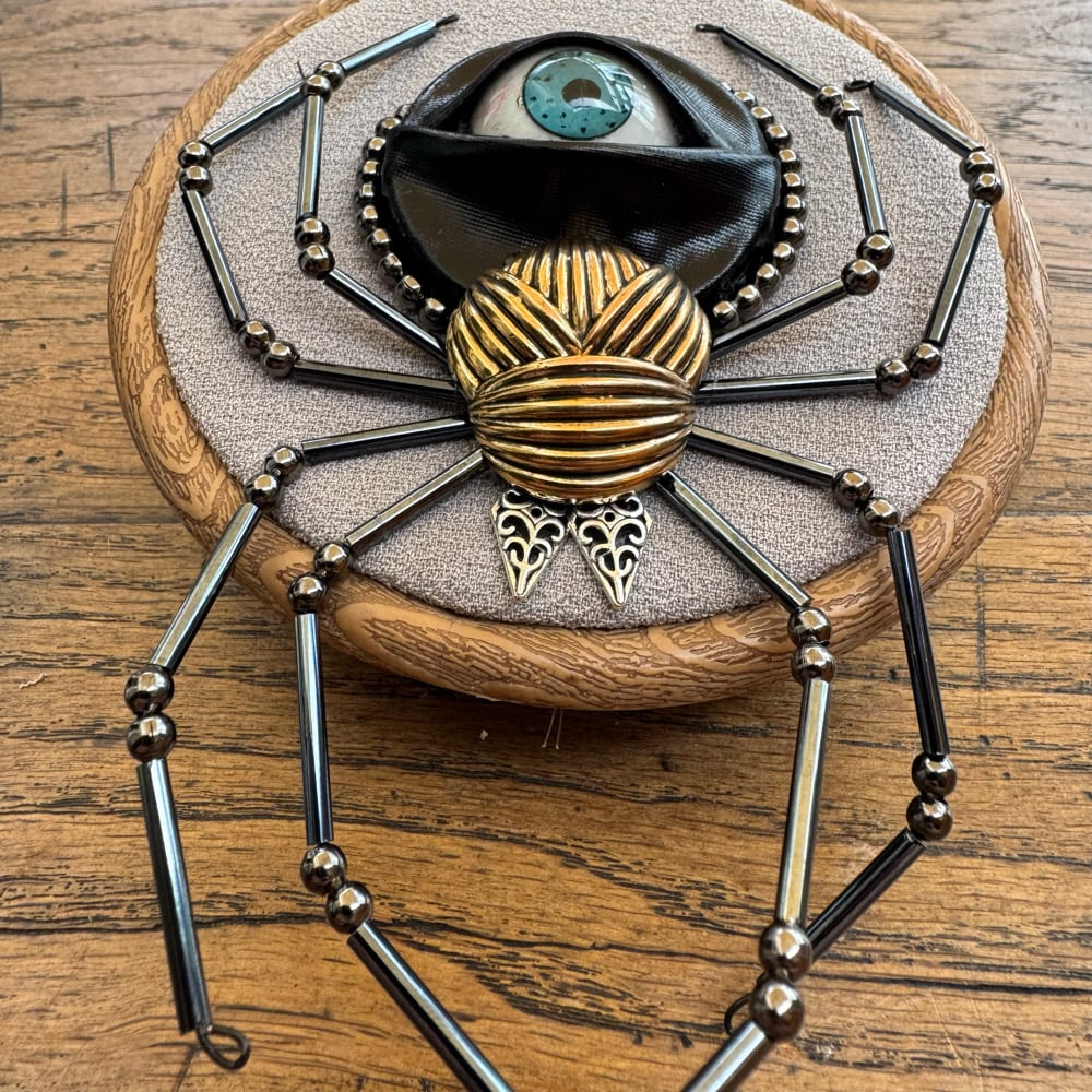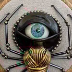 Featuring repurposed jewelley, beads and a human prosthetic eye encased in feveric.