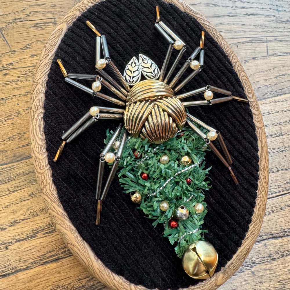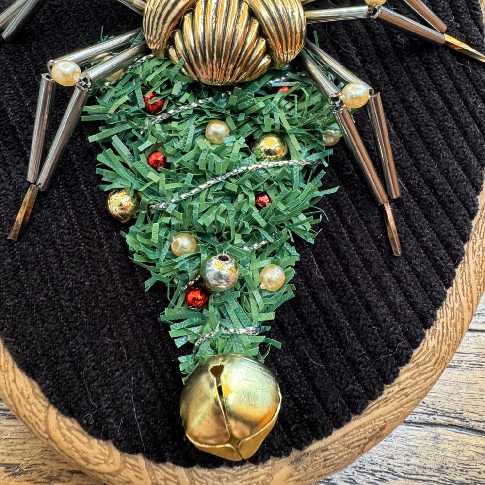 Featuring repurposed jewellery, beads, a jigle bell and a faux tree branch.