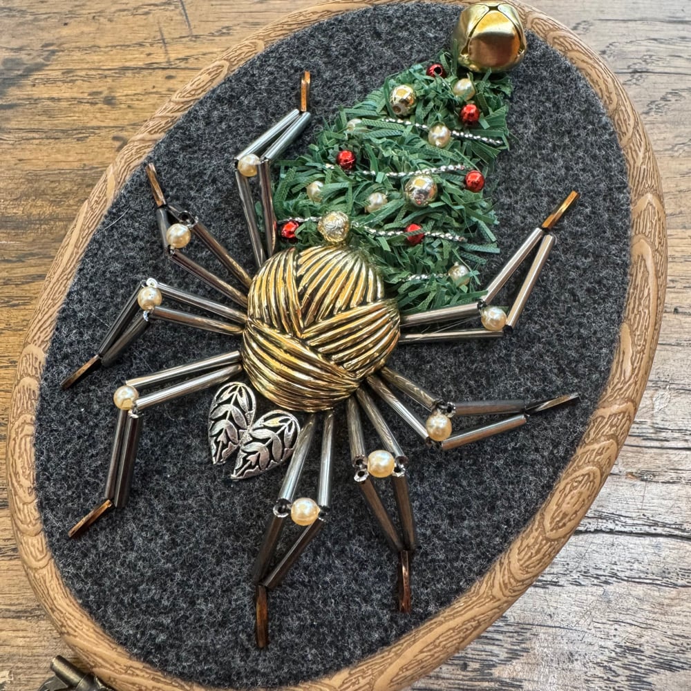 Featuring repurposed jewellery, beads, a jigle bell and a faux tree branch.